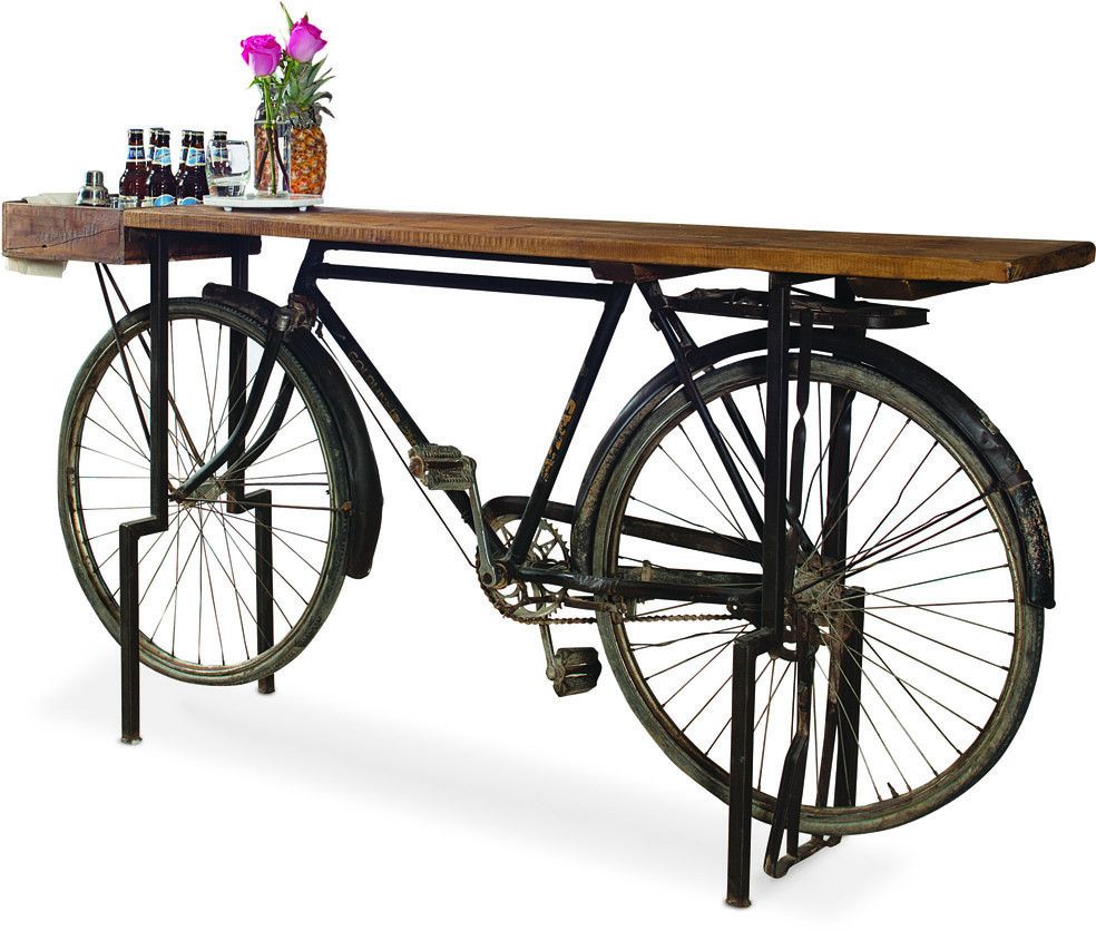 The Small Gathering Table is made with a reclaimed wood top and a salvaged commuter bicycle base. Ridden on the streets of India, every bike has a unique patina that we have preserved for authenticity and character. Both the color of the bike and its finish vary from piece, adding to its singular look. Roll in style with the Small Cycle Gathering Table.
