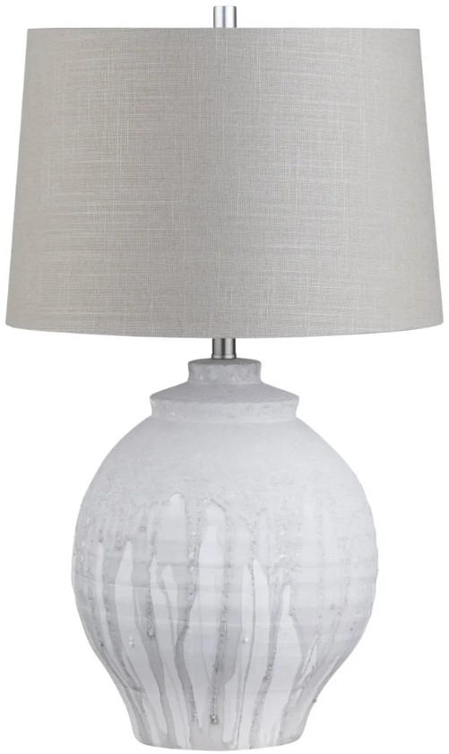The Adams table lamp combines ceramic and metal with a hand-painted textured grey and white body, creating a sophisticated yet artistic design. It accommodates a 150-watt, three-way bulb (not included) for versatile lighting. The textured grey linen tapered drum shade adds elegance and complements the lamp's neutral palette.Read More