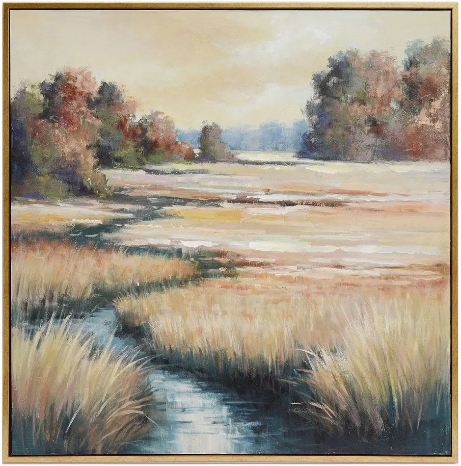 Introducing our Alston 1 canvas painting, a classic piece that beautifully captures the serene charm of a traditional landscape scene. This canvas depicts a picturesque wetland area with lush trees in the distance, awash in rich and earthy color tones of greens, browns, yellows, and blues.Read More