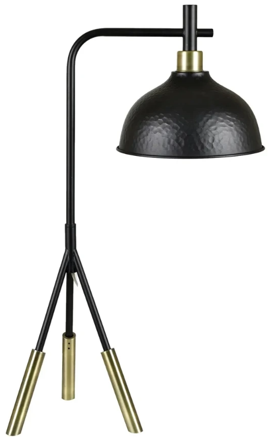 This contemporary table lamp showcases a sleek, industrial-inspired design crafted entirely from metal. The black hammered dome-shaped shade exudes a bold yet refined look, perfectly balanced by its streamlined body. A distinctive tripod base with gold accents adds a touch of elegance, enhancing its visual appeal.Read More