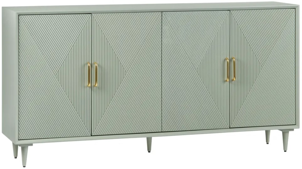 Store your dining accompaniments or entertainment accessories in this Crestview Collection Arvada 4-door Sideboard. The light sage finish and contrasting gold cabinet door pulls bridge the style gap in any home's space. Diagonal detailing across each cabinet door and the sleek dark exterior will catch the eye and fit into modern as well as transitional styled rooms.Read More