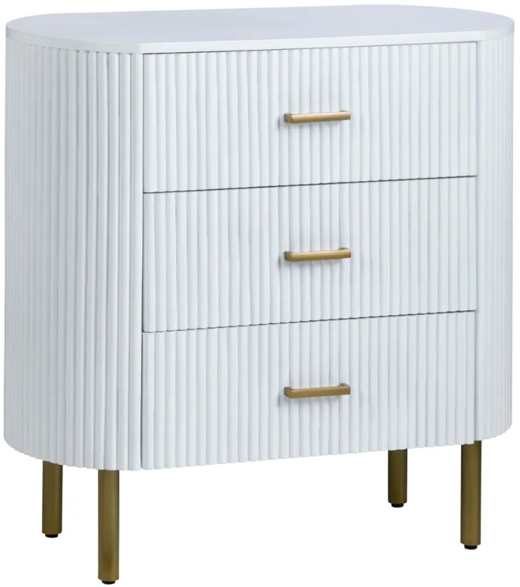 Crisp, bright, and texture-rich, this accent chest features vertical fluting and soft-oval corners for designer dimension. Gold handles and slim legs add a subtle shine, while its matte-white, painted, and powder-coated finish houses three drawers that keep spaces organized from the foyer to the guest room.Read More