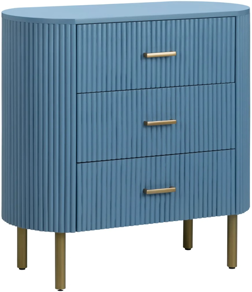 Make a color statement without sacrificing storage. Wrapped in ribbed panels and finished in rich denim blue, this three-drawer chest offers stealth organization on airy brass legs - perfect for entry catch-all, bedside books or cocktail napkins.Read More