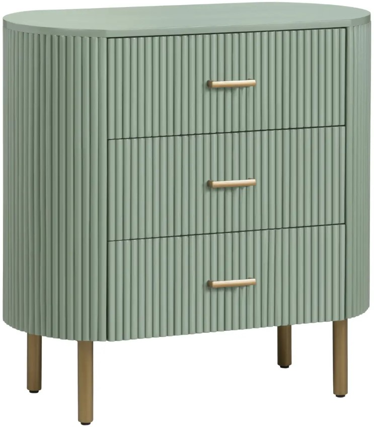 Soft sage goes sculptural. Vertical flute grooves wrap this demi-oval chest, creating subtle shadow play while slim brass legs lighten the footprint. Three smooth-glide drawers hide linens, tech or toys—ideal for hallways, nurseries or chic home offices.Read More
