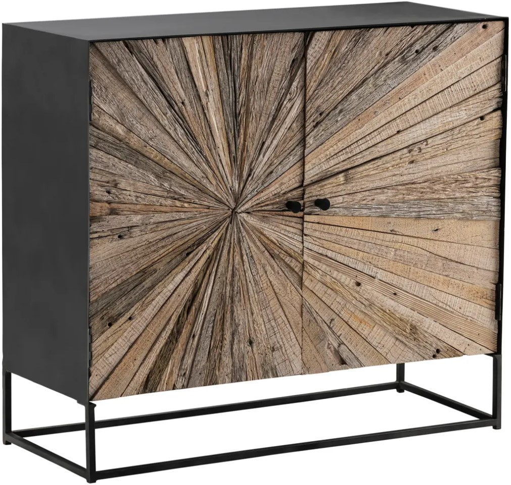The Crestview Collection Bazemore Cabinet has a black metal casing and box stand that highlights the offset starburst pattern of the two-light wood doors. With the character of old barn wood, this rough and rustic cabinet manifests the wear and charm of aged wood.Read More