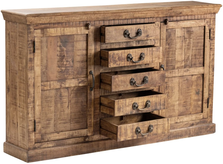 The Crestview Collection Bengal Manor Mango Wood 5-drawer 2-door Sideboard boasts a medium brown finish with some touches of a rustic feel with the metal handles. The mango wood offers a beautiful pattern that is sure to be admired within your home.Read More