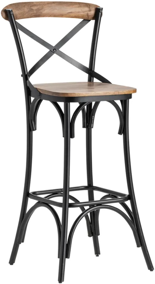 The back of the stool has an X-shape design of metal with a panel of wood at the top.