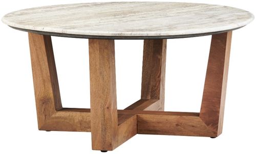 This cocktail table balances earthy texture with structural charm. A round gray travertine top with soft white veining sits over a warm wood base, where angled legs connect into a framed platform design. The open construction adds lightness to the solid materials. Floor levelers included for added stability.Read More