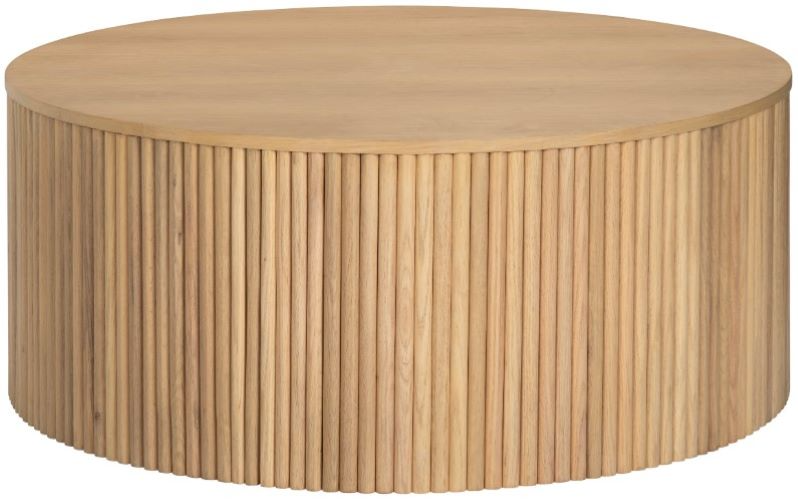 Warm, relaxed and quietly modern. Dozens of slim wood slats cloak a 38-inch round drum in a sun-washed natural finish, creating subtle shadow play while offering a broad, family-friendly surface for charcuterie boards, art books or puzzle nights.Read More