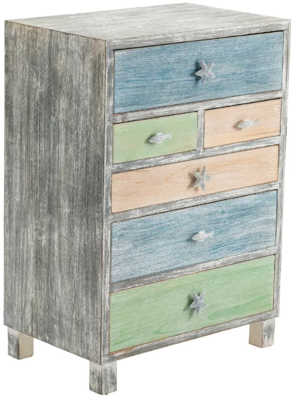 This Crestview Collection Key West gray Driftwood and Multi Color Nautical 6-drawer Chest has a light and buffed sand white finish that adds softness to your room. Each of the six drawers alternate gray and blue colors and sport cheerful fish and starfish drawer pulls.Read More