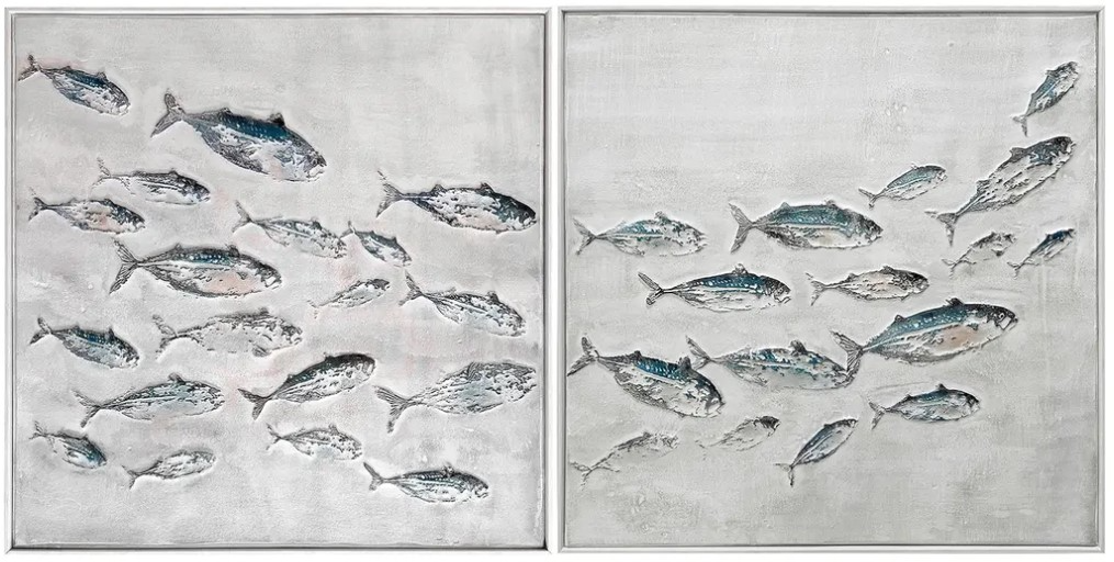 The Montague set of 2 heavily textured coastal paintings on canvas showcases a school of fish gracefully swimming across both canvases. Set against a soft gray background with touches of blue and dark grey, each piece exudes coastal serenity. Finished in sleek white frames for a clean, modern touch.Read More