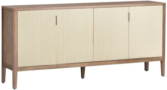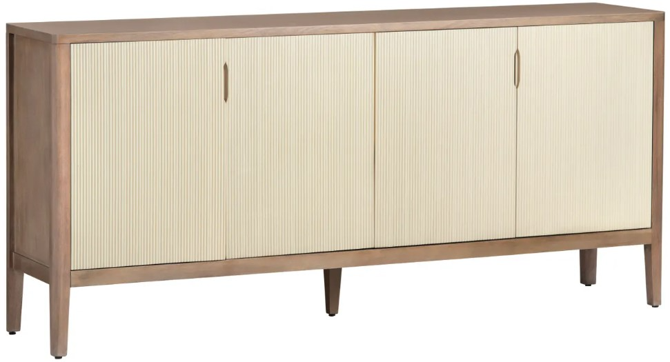 Transform your living space with our elegant four-door media credenza. Featuring a warm brown frame with a natural wood grain finish and cream doors, touched with a subtle yellow undertone, this piece exudes timeless charm.Read More