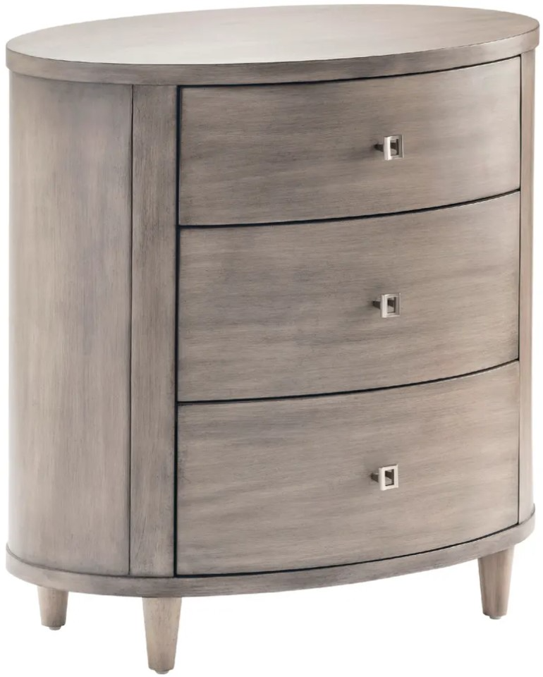 This Crestview Collection Hawthorne Estate gray Wash Oval Chest is a nightstand with a flair for storage that accents your most intimate home decor with its medium gray acacia wood finish. Three drawers are centered in the soft oval form of the piece, leading down to tapered legs for a stable and modern feel.Read More