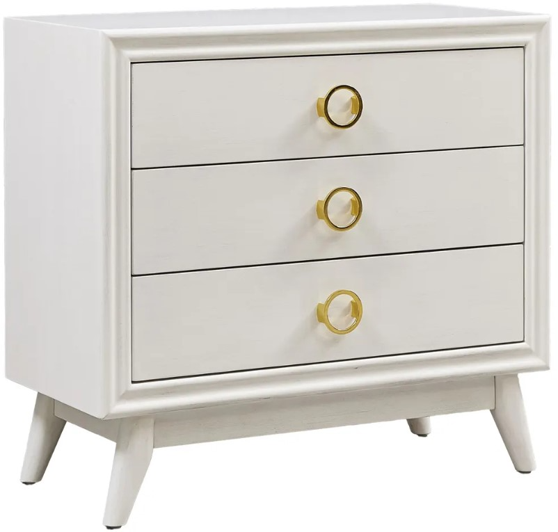 A fresh twist on mid century style. Wrapped in an eggshell white finish, this chest perches on splayed legs and flaunts chunky brass ring pulls for a wink of glamour. Three roomy, felt lined drawers keep entryway catch all or bedside essentials organized in sleek fashion.