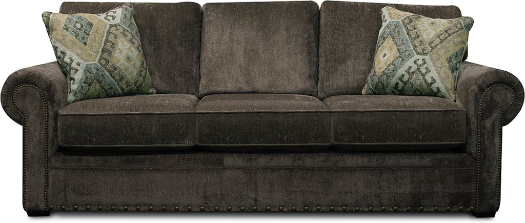 Back and seat construction are both of sinuous wire. Semi attached back cushions are polyester fiber fill with zipper access. The seat cushions are loose (ventilated and reversible) block foam with polyester fiber wrap. Matching welt is standard. Two 20 in pillows are standard. Legs are 2.5 in pyramid screw-in with dark brown finish. Coil cushion and Frame Coil are optional at a small upcharge.
