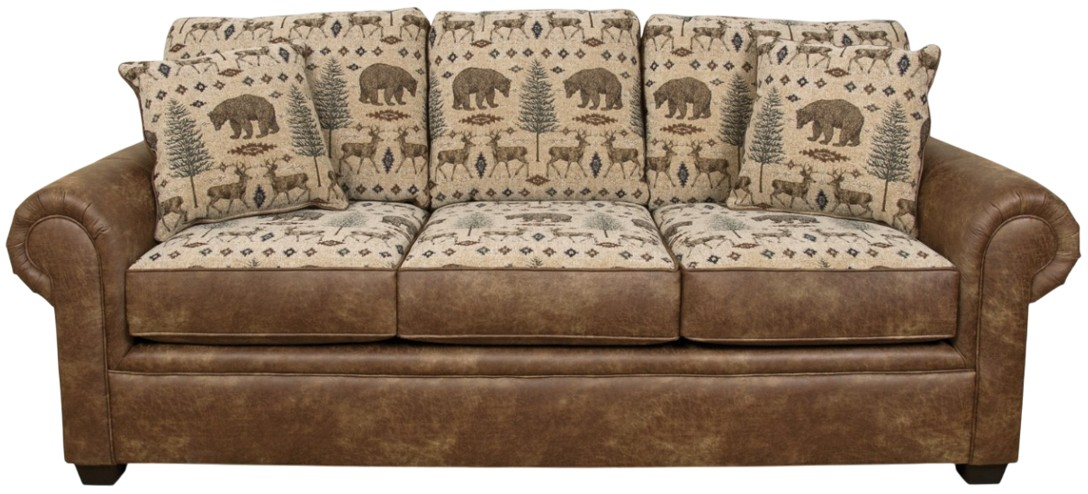 The lodge look is alive and well in our Jaden group. A three cushion style in married fabrics with pyramid legs and rolled and welted arms. Toss pillows are reversible. Novelty patterns combined with a leather-look fabrics provide the perfect choice for your cabin or retreat home.Read More