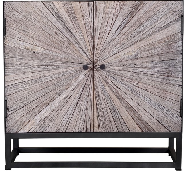 Eye-catching, the dramatic wood starburst pattern on the door fronts are masterfully cut and hand-placed to create an organic and textured look. This piece is balanced out with a grey surround and metal base. Due to the natural variations in the wood grain patterns, each piece is truly unique.Read More