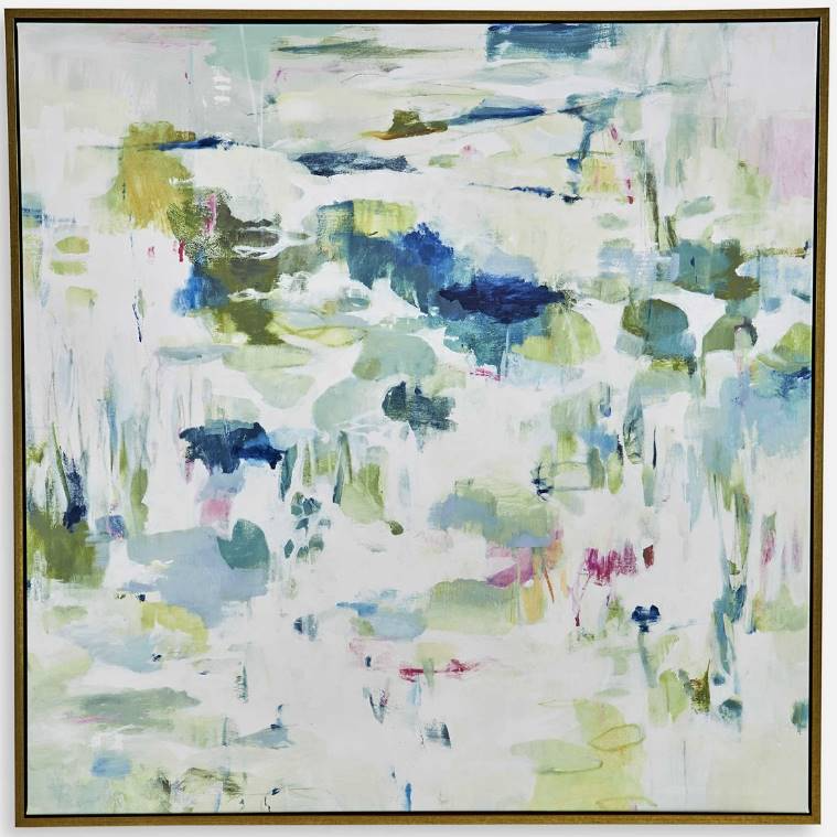 The Abstract Reflections framed canvas features abstract shades of green and blue with highlights of fuchsia. A solid wood gallery frame with gold finish completes the artwork. May be hung horizontal or vertical. Each canvas is proudly handcrafted and printed in the USA. Artwork by Lisa Ridgers.Read More