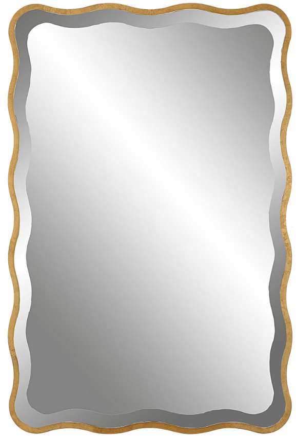 Showcasing a feminine scalloped edge, this shaped wood mirror adds whimsical flair to any design. The mirror is finished in aged gold and has a 1" bevel. Make a bold statement by incorporating this stunning home decor into your home.Read More