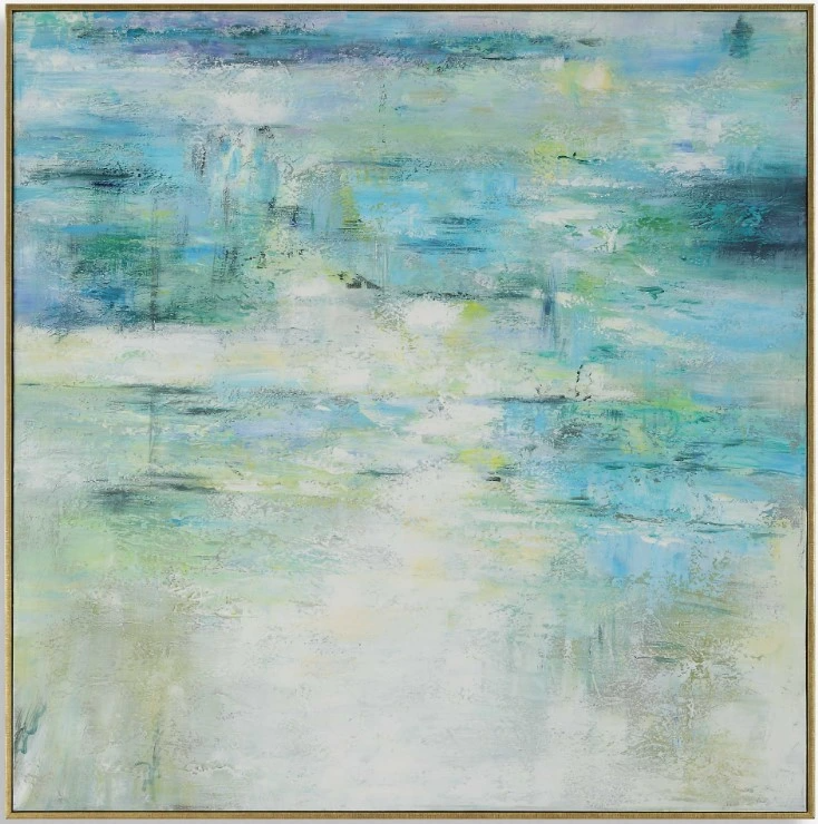 Made up of a bright color palette featuring shades of blue and green and surrounded by a gold gallery frame, Blissful hand painted canvas embodies the essence of tranquility and joy. Due to the handcrafted nature of this work, each piece may have subtle differences.Read More