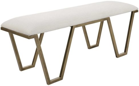 Classic and sophisticated, this accent bench features a geometric iron base in antique gold leaf with an upholstered seat in a crisp white textured fabric.Read More